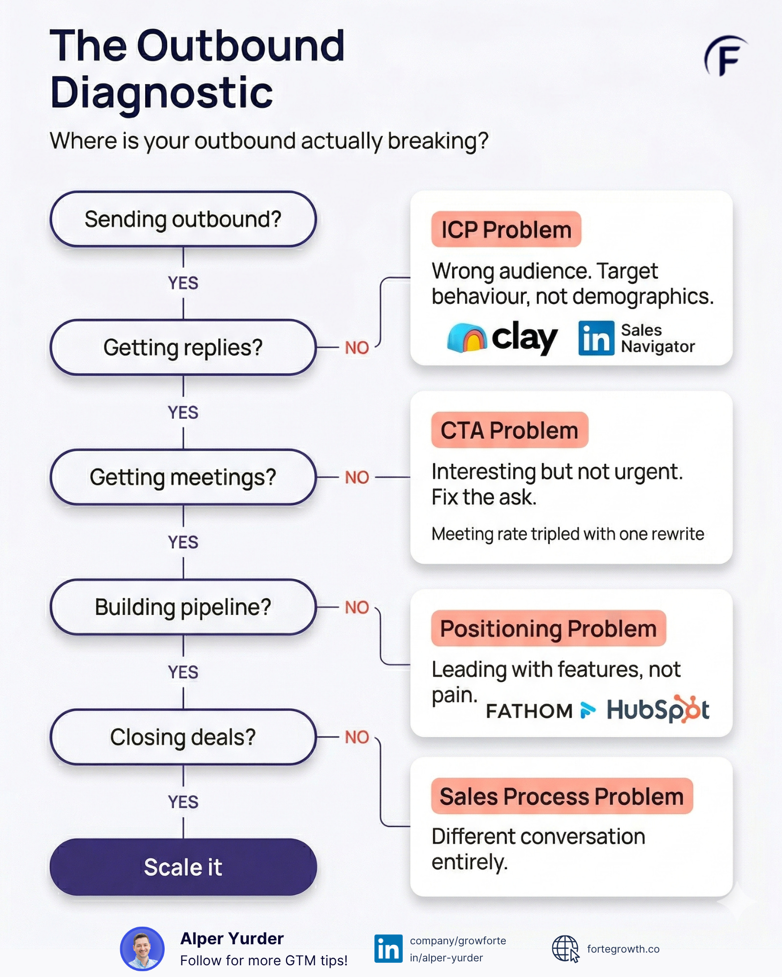 I’ve reviewed 20+ startups’ outbound in the last 3 months. The problem is almost never what founders think it is. Before you rewrite your sequences or buy a new tool, run through these 5 steps: