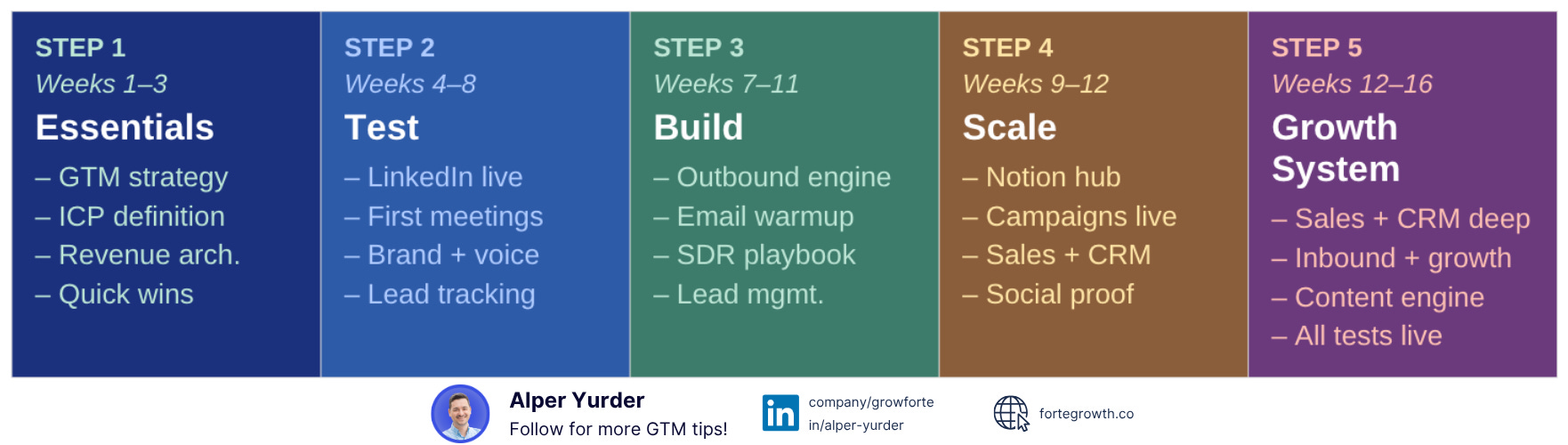 The LinkedIn-first revenue system. 30 steps, no paid ads before message-market fit.